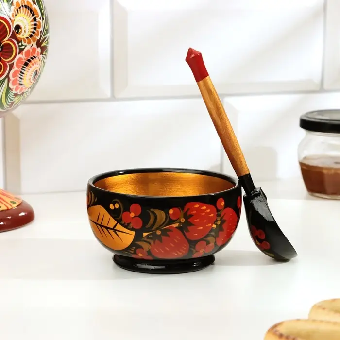Набор посуды из дерева с хохломской росписью — это гармоничное сочетание традиционного русского искусства и функциональности. В комплект входят круглая розетка и ложка, выполненные из берёзы с гладкой текстурой, что обеспечивает приятные тактильные ощущения и долговечность изделий. Яркая цветочно-растительная роспись в золотисто-красно-чёрной гамме создаёт атмосферу тепла и праздничного настроения.