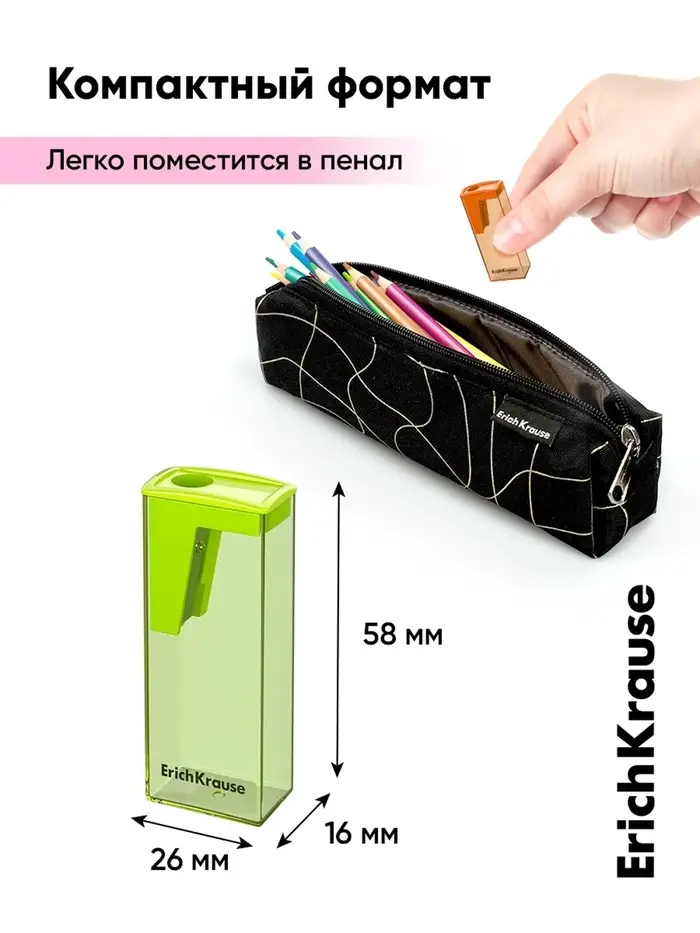 - Отверстие стандартного диаметра рассчитано на привычные грифельные и цветные карандаши.