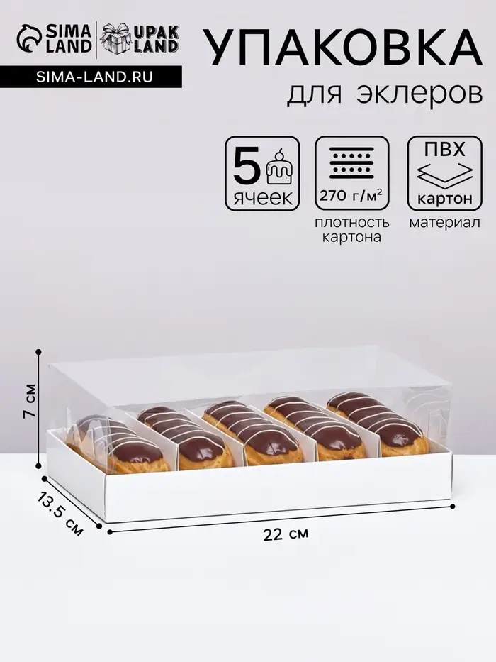 - Вместительная форма для набора десертов: Внутренние размеры 22×13.5×7 см рассчитаны на размещение 4-5 стандартных эклеров, профитролей или подобных пирожных. Это удобно для формирования подарочных наборов, продажи десертов небольшой партией или угощения компании.