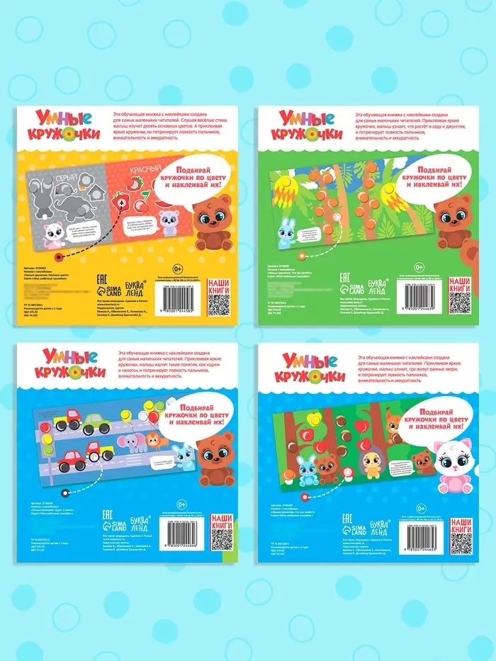 Набор обучающих книг с наклейками создан для самых маленьких читателей. Приклеивая яркие кружочки, малыш узнает многое об окружающем его мире и потренирует ловкость пальчиков, внимательность и аккуратность.