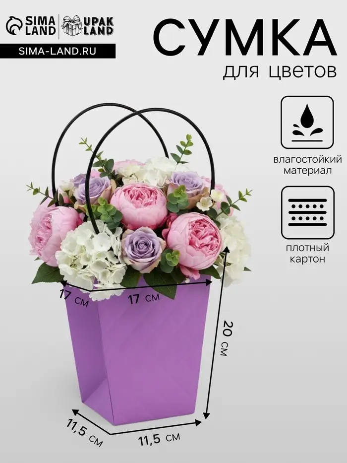 Элегантная водостойкая сумка для цветов — идеальное решение для стильной и удобной упаковки букетов и композиций. Изготовлена из плотного влагостойкого картона, надежно защищает цветы от влаги и деформации. Удобные длинные ручки позволяют легко переносить композицию.