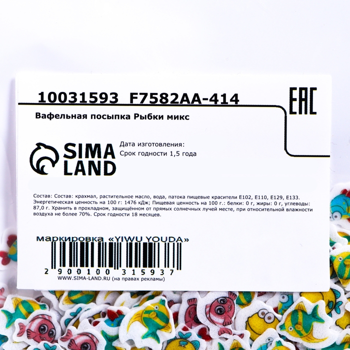Вафельная кондитерская посыпка "Рыбки" - это односторонние съедобные украшения домашней и профессиональной выпечки. Съедобные украшения для кондитерских изделий не нужно вырезать, они уже полностью готовы к использованию. Вафельное украшение в форме рыбок можно использовать для украшения торта, выпечки, кулича, пряников, пирожных, капкейков и любых других кондитерских изделий. Не имеет вкуса и запаха, полностью съедобно. Рекомендуется украшать вафельными посыпками непосредственно перед подачей блюд.