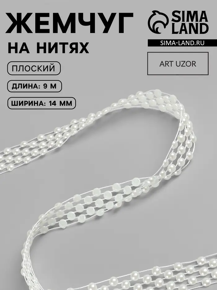 Плоский жемчуг на нити — универсальный элемент декора для творческих проектов и праздничного оформления. Плоские бусины диаметром 14 мм нанизаны на прочную нить длиной около 9 метров. Материал — долговечный пластик, устойчивый к выгоранию и повреждениям.