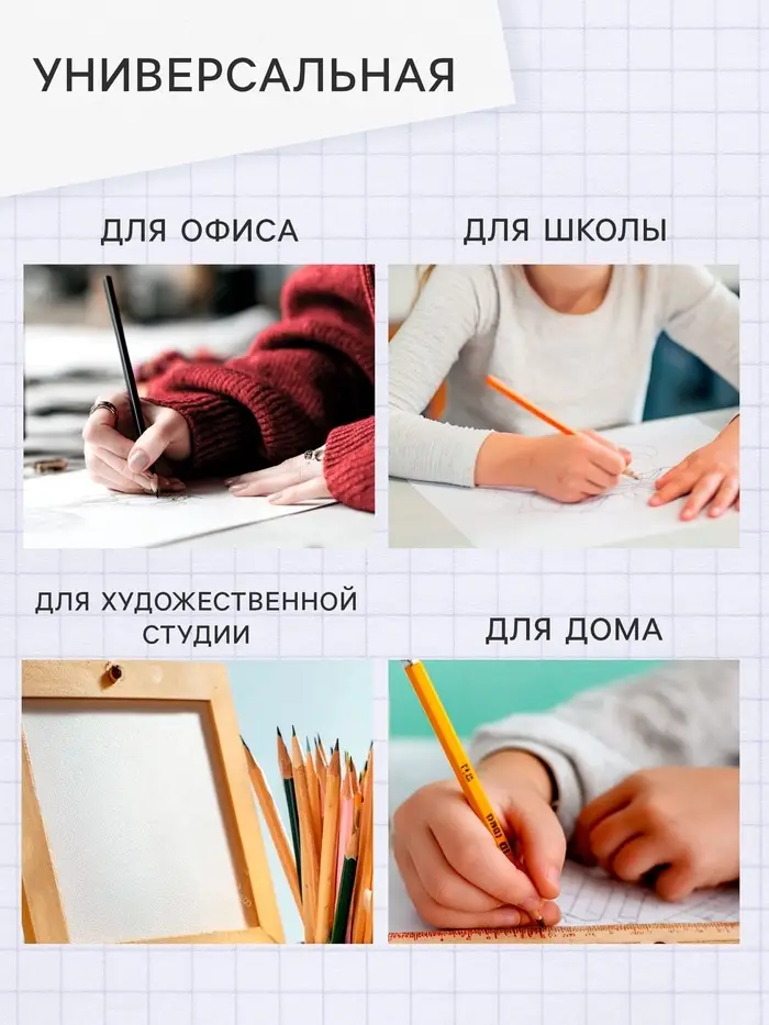 - Одно стандартное отверстие — совместимо с большинством карандашей для письма и рисования.
