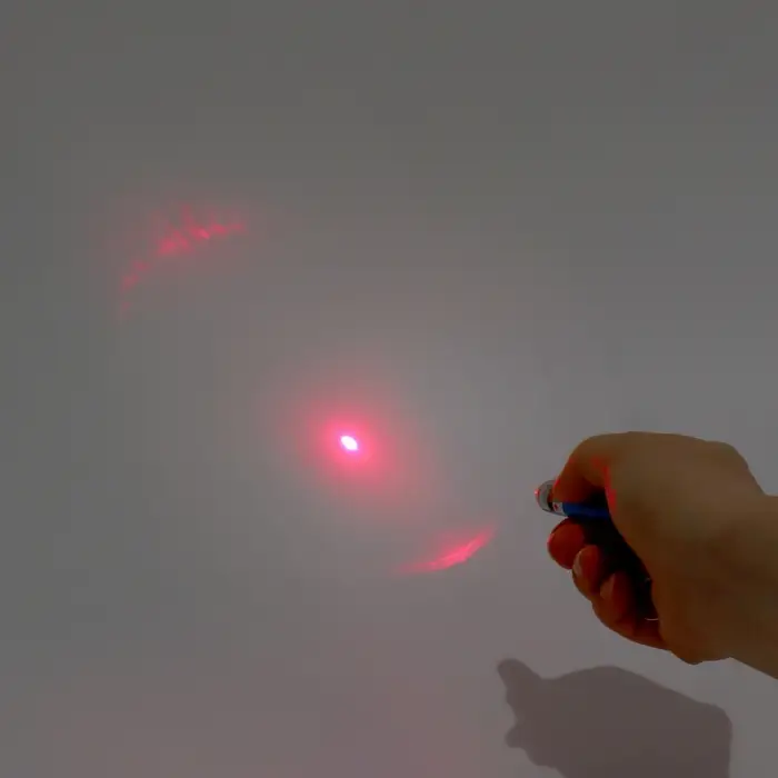 Указка излучает яркий красный свет, который движется по поверхности, привлекая внимание кошки.