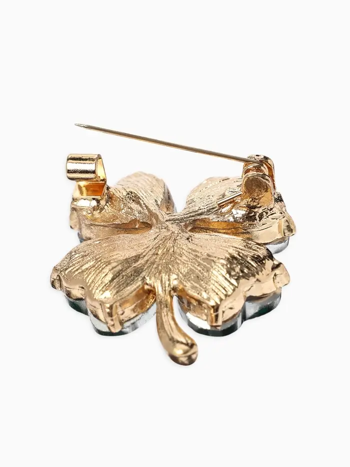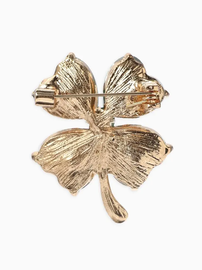 - Магический четырехлистник. Тематика оберегов и символов делает эту брошь не просто аксессуаром, а значимым элементом гардероба. Каждый лепесток наделен своим смыслом, направленным на гармонию и успех.