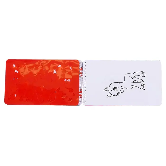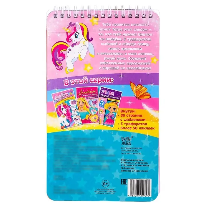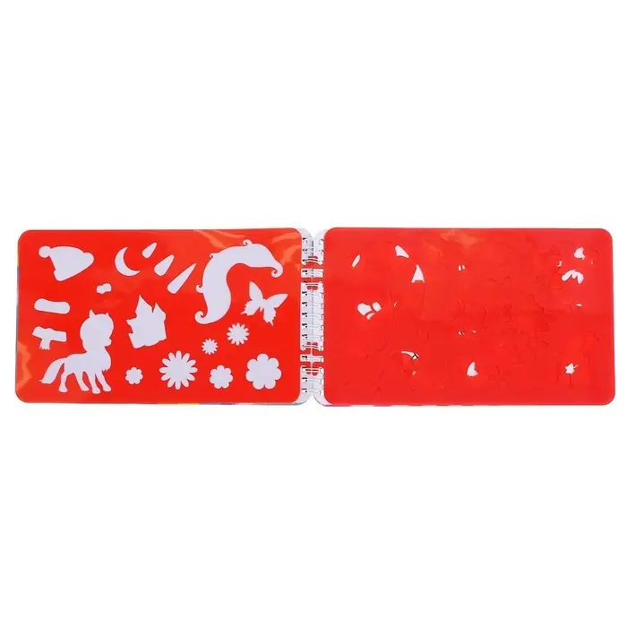 В альбоме есть 5 листов с пластиковыми трафаретами, которые можно снимать и в дальнейшем использовать для создания поделок. Также внутри есть 2 листа наклеек, инструкция, 36 страниц с шаблонами картинок, которые ребёнок должен дорисовать, и 36 чистых страниц для свободного творчества. Малыш сможет проявить фантазию и украсить рисунки наклейками.