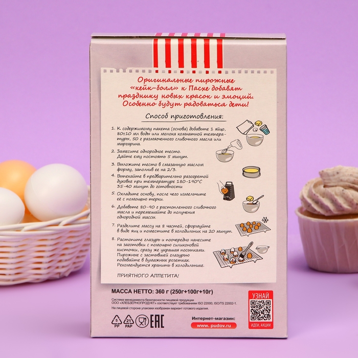 В набор «Пасхальное яйцо кейк-болл» мы поместили готовую смесь для выпечки бисквита, шоколадные капли для белой глазури, посыпку, а также 8 бумажных розеток для порционной подачи.