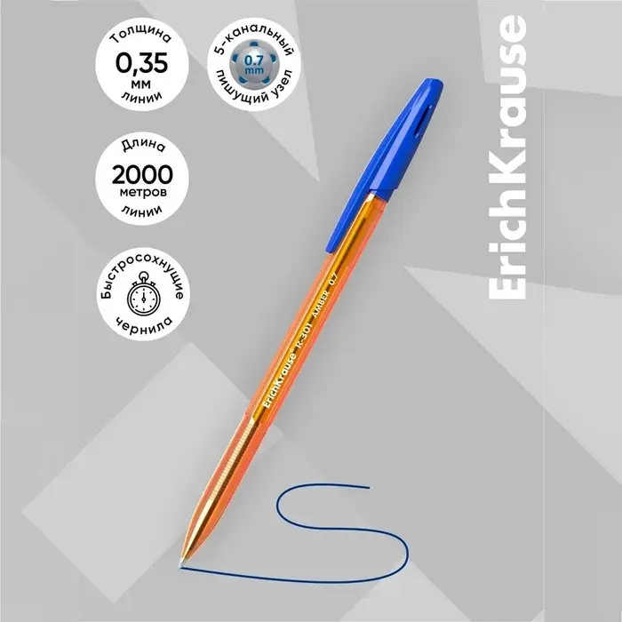 Классическая шариковая ручка Stick со стандартным типом пишущего узла и заменяемым стержнем. Ручка имеет полупрозрачный оранжевый шестигранный корпус с удобной профилированной грип-зоной и вентилируемый колпачок. Цвет колпачка и заглушки соответствует цвету чернил. 5-канальный пишущий узел с диаметром шарика 0.7 мм в сочетании с быстросохнущими чернилами обеспечивает точное и быстрое письмо. Длина непрерывной линии составляет 2000 м при толщине 0.35 мм , что является одним из лучших показателей в своей категории. Модель R-301 Stick Amber 0.7 имеет узнаваемую запатентованную форму и стала одним из бестселлеров в ассортименте шариковых ручек ErichKrause более чем в пятидесяти странах мира