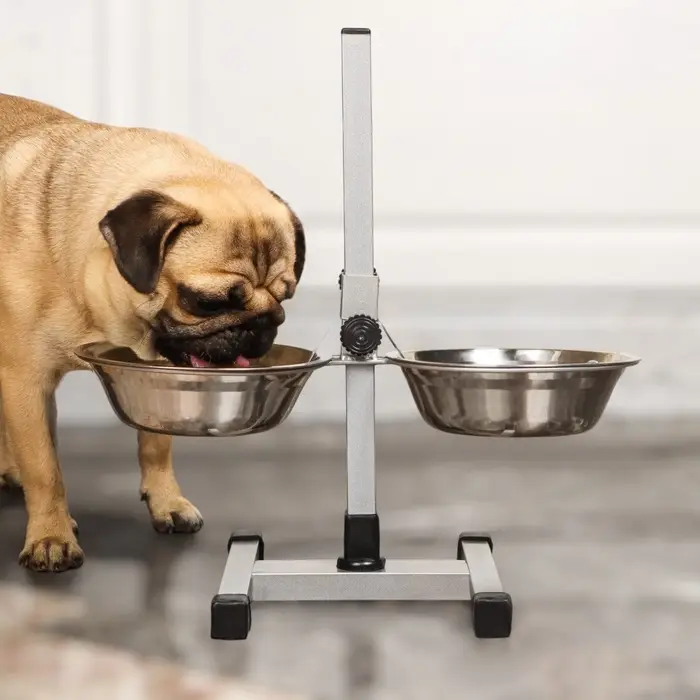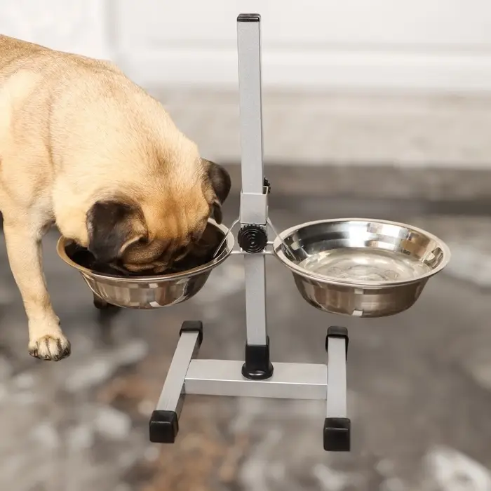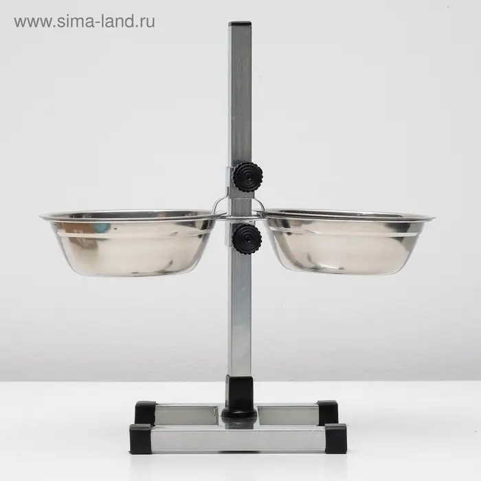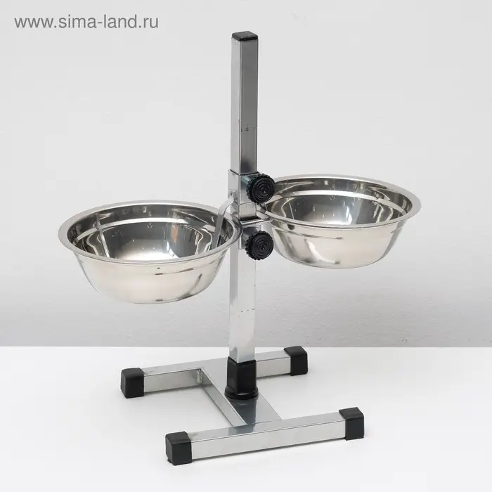 Стойка с 2-мя мисками для кормления сразу нескольких животных, это – идеальное решение для кормления щенков и собак подростков, живущих на одной территории. Качественные, практичные и функциональные миски для собак размещены на регулируемой подставке, которая будет расти вместе с вашими малышами. Винтовая кормушка убережёт помещение от загрязнения кормом и водой. Металлическая конструкция очень устойчивая, поэтому ее очень сложно сдвинуть или опрокинуть даже самым активным щенкам. Стойка и миски хорошо переносят обработку горячей водой, моющими и дезинфицирующими средствами.