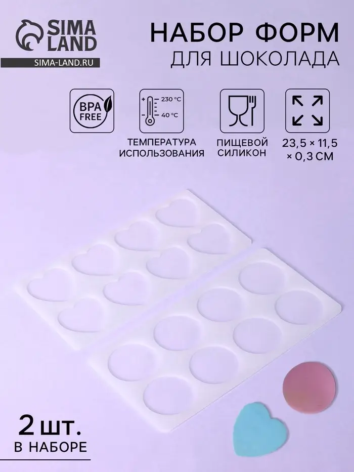 - 2 формы в комплекте: одна с сердцами, другая с круглыми/геометрическими ячейками — больше гибкости при создании десертов.