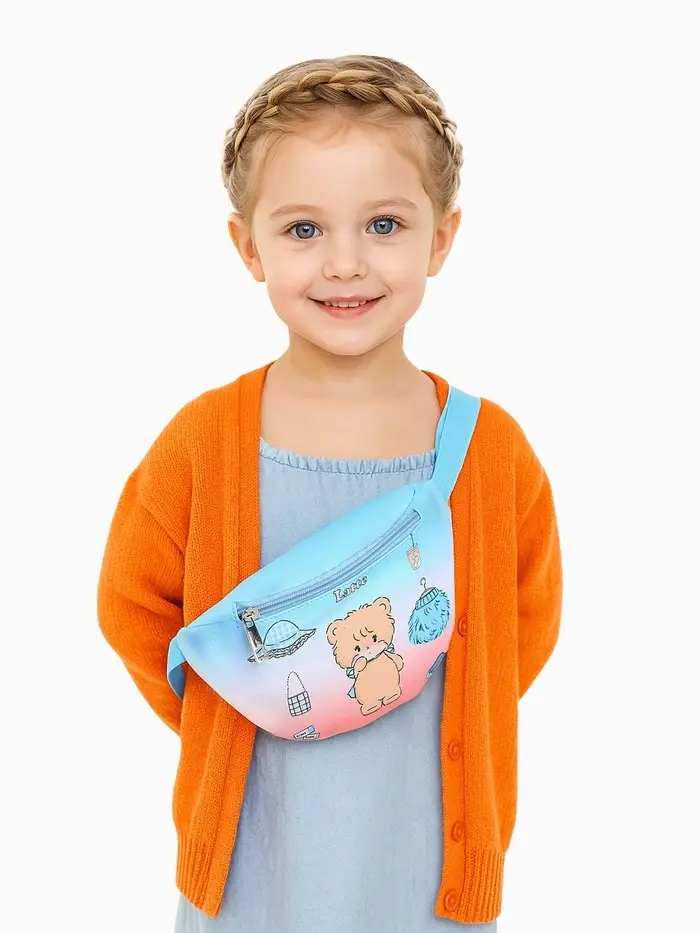 Эта голубая поясная сумка с милым медвежонком станет верным спутником для маленькой модницы. Её компактный и лёгкий формат освобождает руки для игр и открытий, а регулируемый ремешок надёжно фиксирует её на поясе или через плечо. Молния надёжно хранит детские секреты и сокровища, будь то первый самостоятельно купленный леденец или найденная на прогулке шишка.