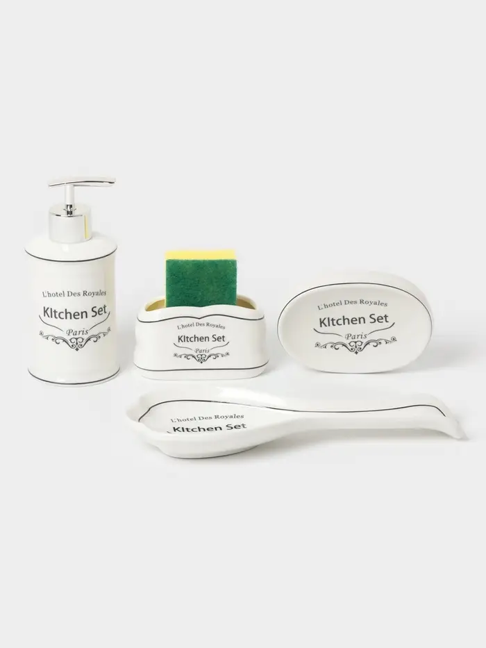 Набор аксессуаров для кухни организует пространство и станет стильным украшением Вашей кухни. За счет сдержанного дизайна данный керамический набор в ванную подойдет к любому дизайну. Набор состоит из 4 предметов: мыльница, дозатор, подставка для губки, подставка для ложки.