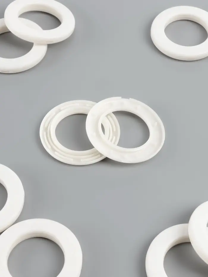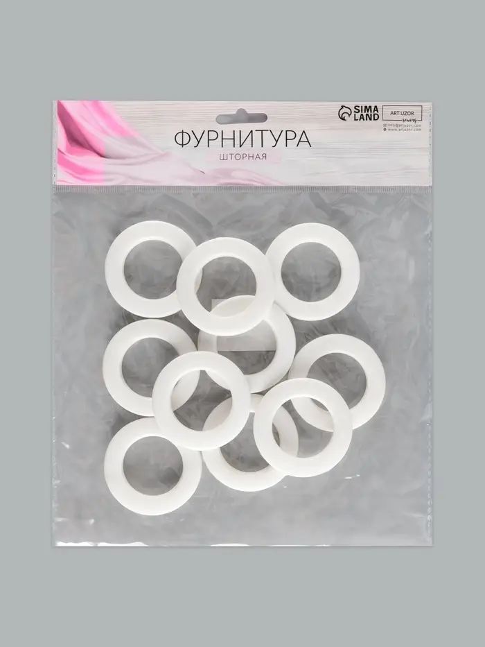 - В комплекте 10 шторных люверсов белого цвета с матовой поверхностью.