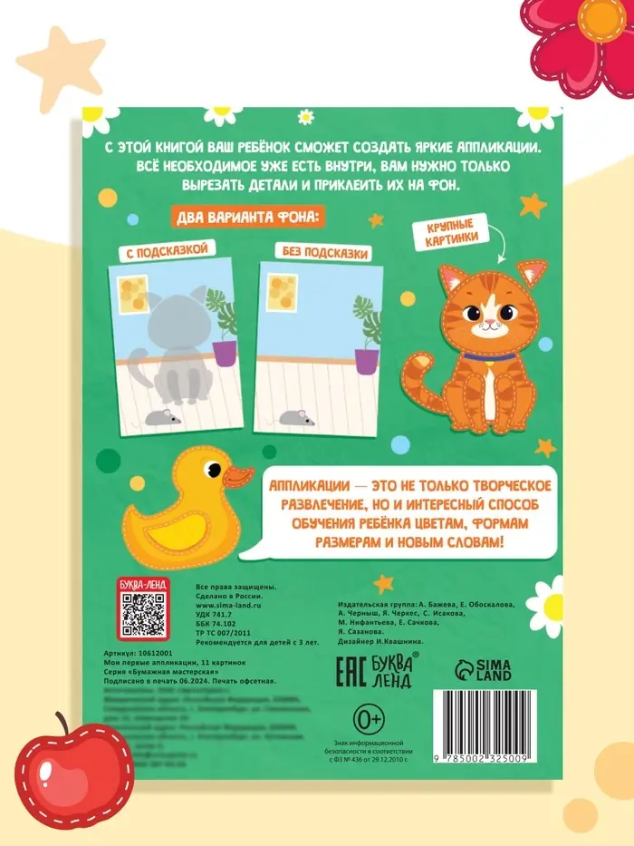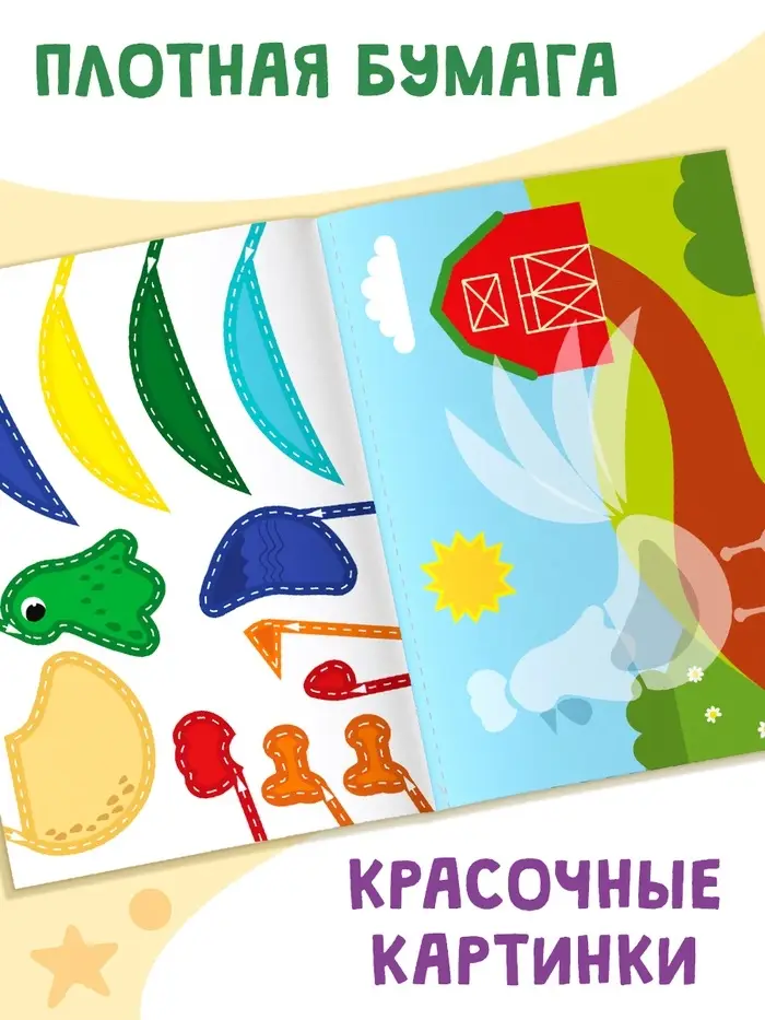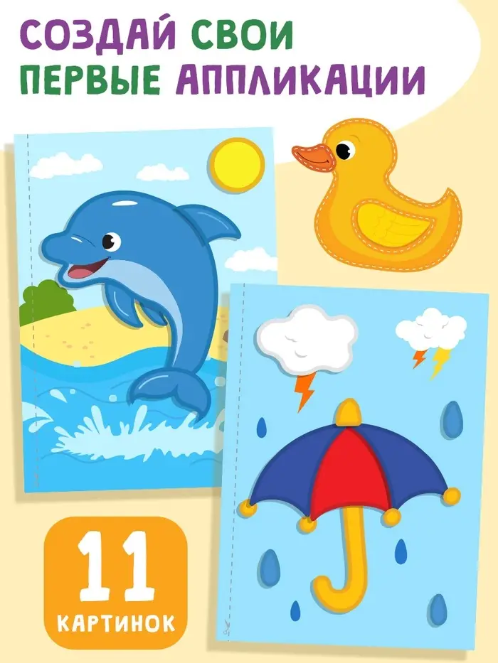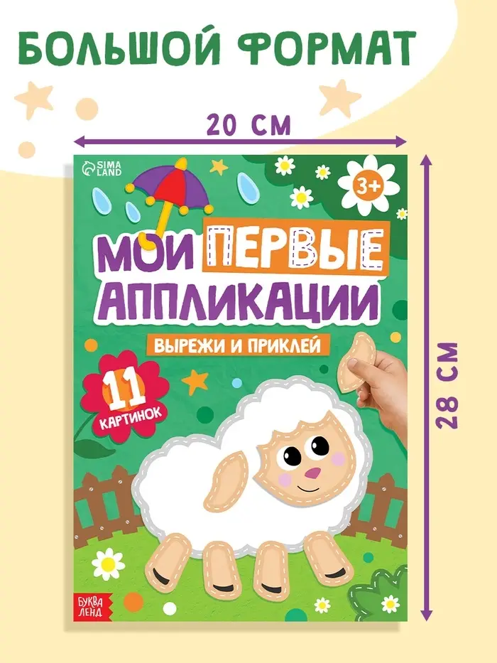 Книжка «Мои первые аппликации» познакомит малыша с новым видом творчества. В книге 11 красочных картинок, которые ребёнок сможет «оживить» сам! Для этого нужно выбрать вариант фона — с подсказкой или без, аккуратно вырезать детали и приклеить их на картинку. Кропотливая работа развивает мелкую моторику и усидчивость, которые важны для повседневной жизни.
