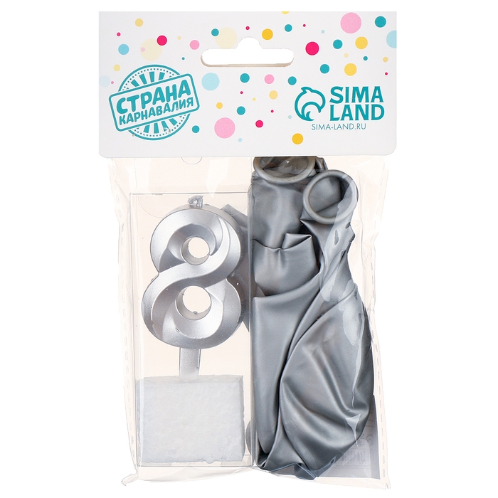 Свечи для торта + 5 шаров, цифра 8, серебро