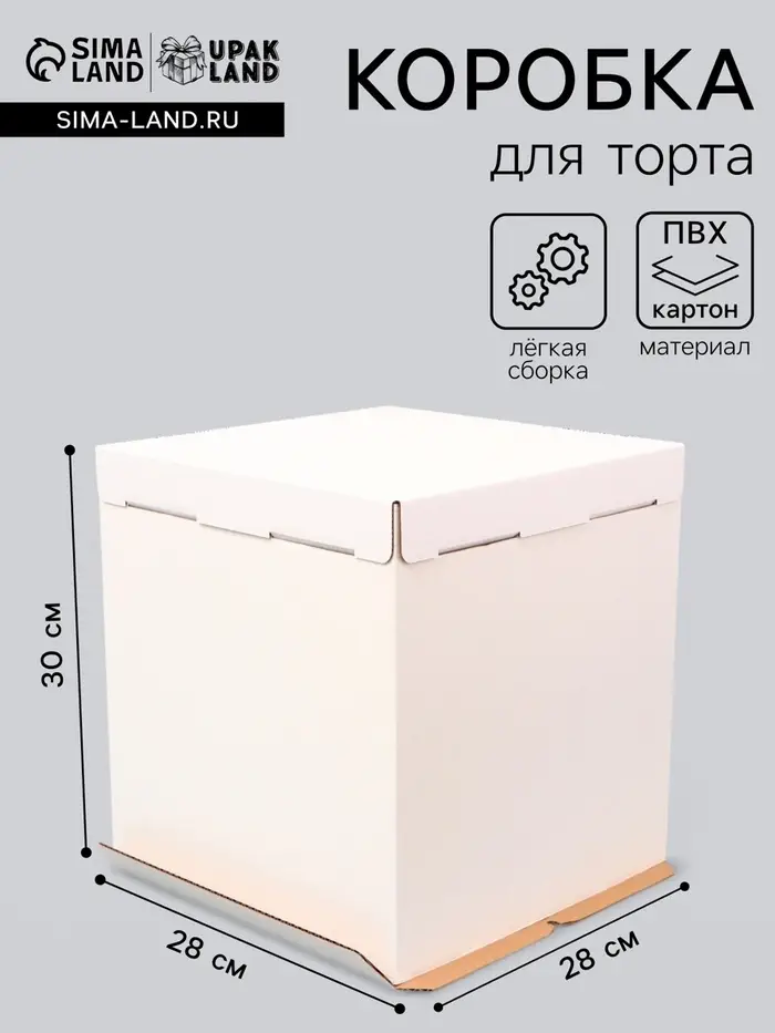 - Увеличенная высота 30 см для многоярусных тортов: Вместительная коробка идеально подходит для упаковки высоких двух- и трехъярусных тортов, десертов с крупным декором из мастики, шоколада или живых цветов. Квадратное основание 28×28 см обеспечивает устойчивость конструкции и предотвращает опрокидывание.