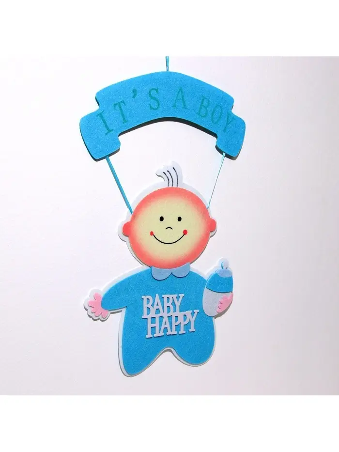 Подвеска «Baby Happy Boy» — объёмное украшение для гендер-пати, посвящённого будущему мальчику. Её мягкие формы из фетра и текстиля в голубой гамме добавляют уюта и радостного ожидания в праздничное оформление. Высота 52 см делает её заметным, но уравновешенным элементом — идеально подходит для фотозоны, стены над столом или дверного проёма.