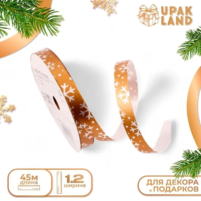 Лента для декора и подарков новогодняя «Снежинки», 1.2 см × 45 м, золотая.