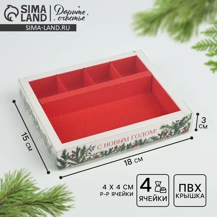 Коробка под 4 конфеты и шоколад новогодняя с ячейками «Еловый аромат» 18×15×3 см