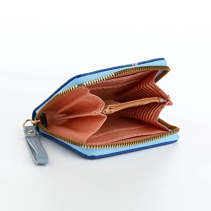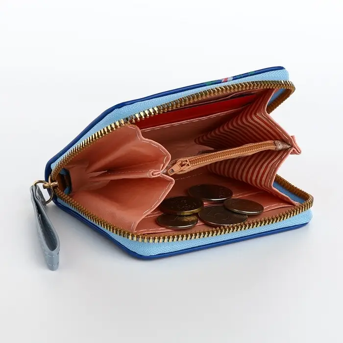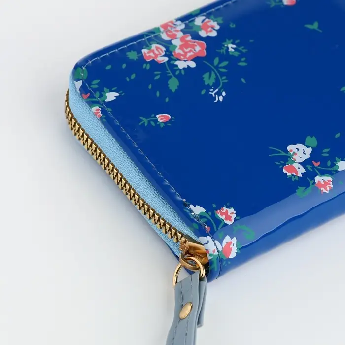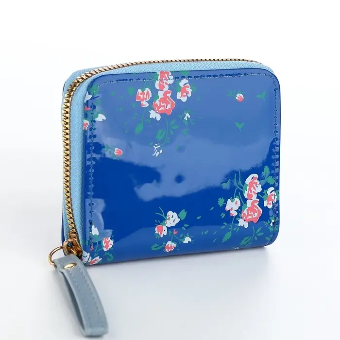 Этот лакированный кошелёк на молнии — стильный и практичный спутник для повседневного образа. Он легко вместит всё необходимое: мелочь, купюры и карты. Синий лаковый блеск и цветочный принт делают аксессуар по-настоящему женственным и заметным.