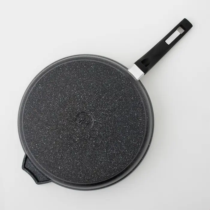 Серия Гранит — это литая алюминиевая посуда с антипригарным покрытием повышенной стойкости, с содержанием частиц твердых минералов.