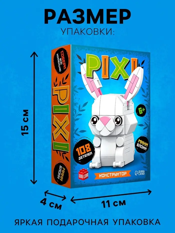 Конструктор блочный UNICON «PIXI. Зайка», животные, мини блоки, 108 деталей