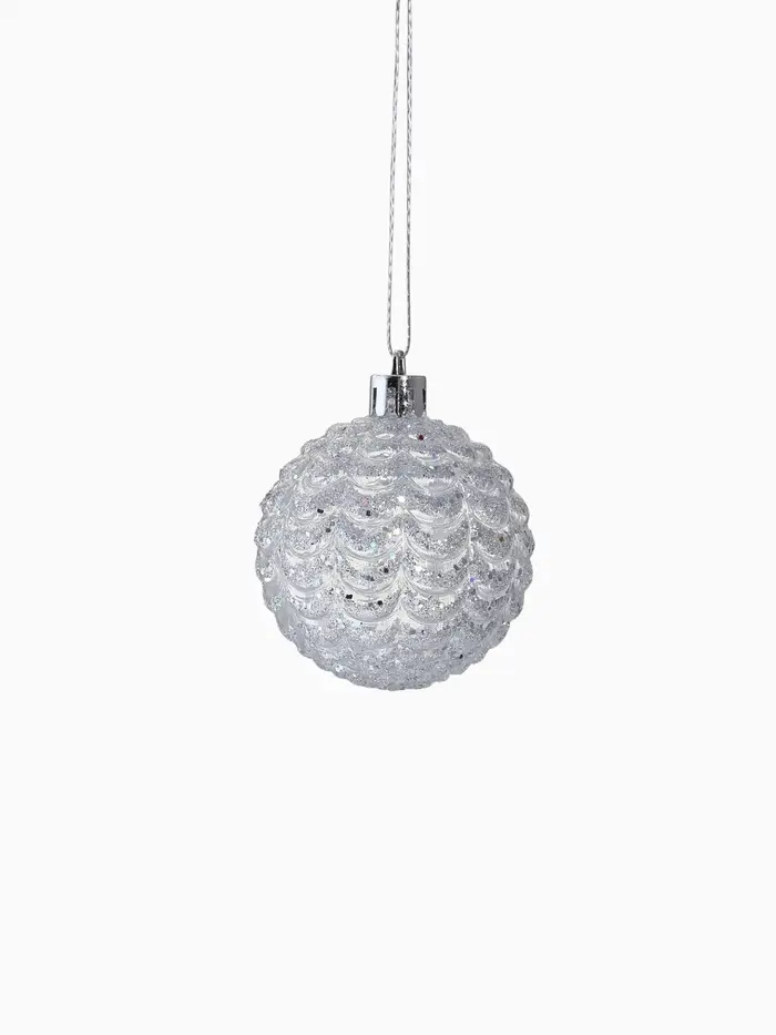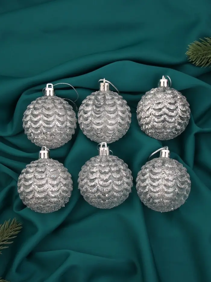 - Комплект из 6 шаров с прозрачной серебристой поверхностью.