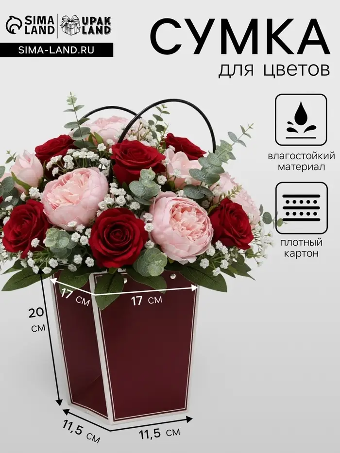 Элегантная водостойкая сумка для цветов — идеальное решение для стильной и удобной упаковки букетов и композиций. Изготовлена из плотного влагостойкого картона, надежно защищает цветы от влаги и деформации. Удобные длинные ручки позволяют легко переносить композицию.