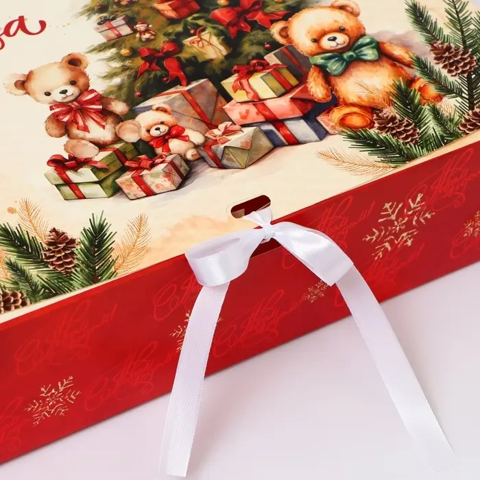 Складная подарочная коробка с новогодним дизайном и лентой — это элегантное и практичное решение для упаковки праздничных подарков, которое сочетает в себе стиль и удобство. Коробка изготовлена из плотного картона, что обеспечивает ей прочность и устойчивость, сохраняя ваш подарок в идеальном состоянии до момента вручения. Её складная конструкция позволяет легко собрать и разобрать коробку, что упрощает хранение и транспортировку.