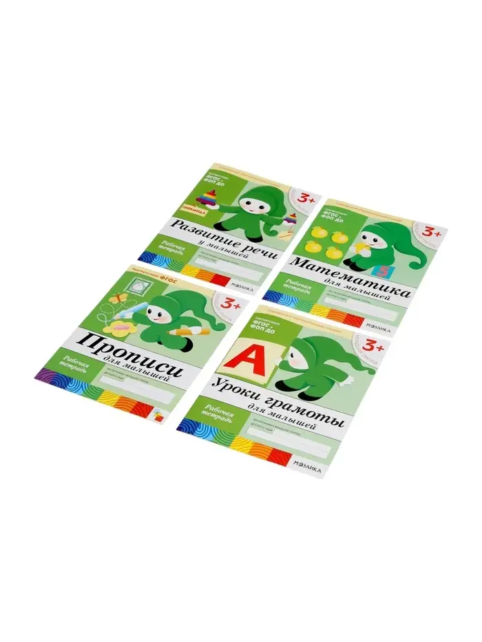 - Рабочая тетрадь «Математика для малышей 3+», которая поможет развить у ребенка элементарные математические представления. Ребенок познакомится с понятиями «ни одного», «один» и «много», научится работать с множествами, узнает, чем отличаются простейшие геометрические фигуры.