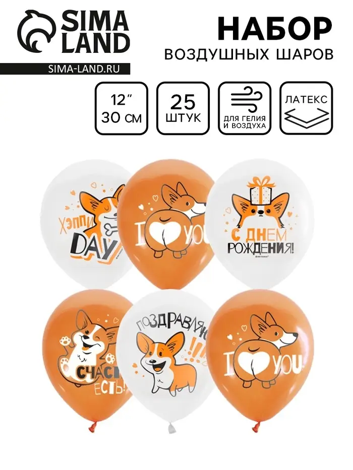 Воздушные шары латексные 12" «С днём рождения. Корги», 25 шт.
