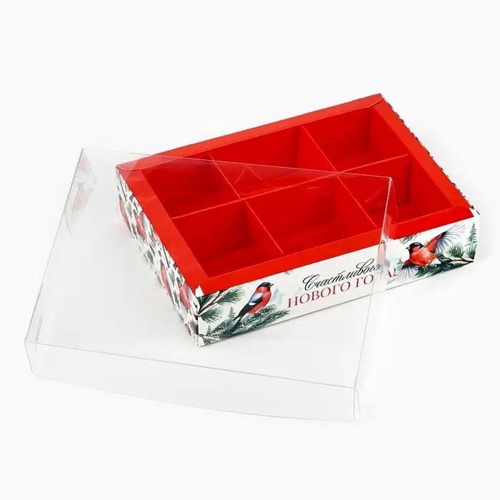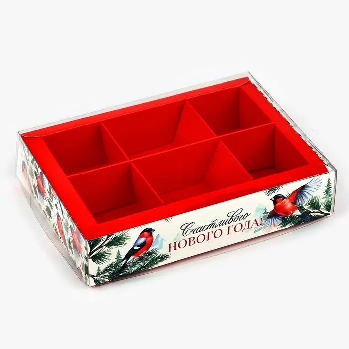 Коробка под 6 конфет новогодняя с ячейками «Снегири», 10×14.5×3 см