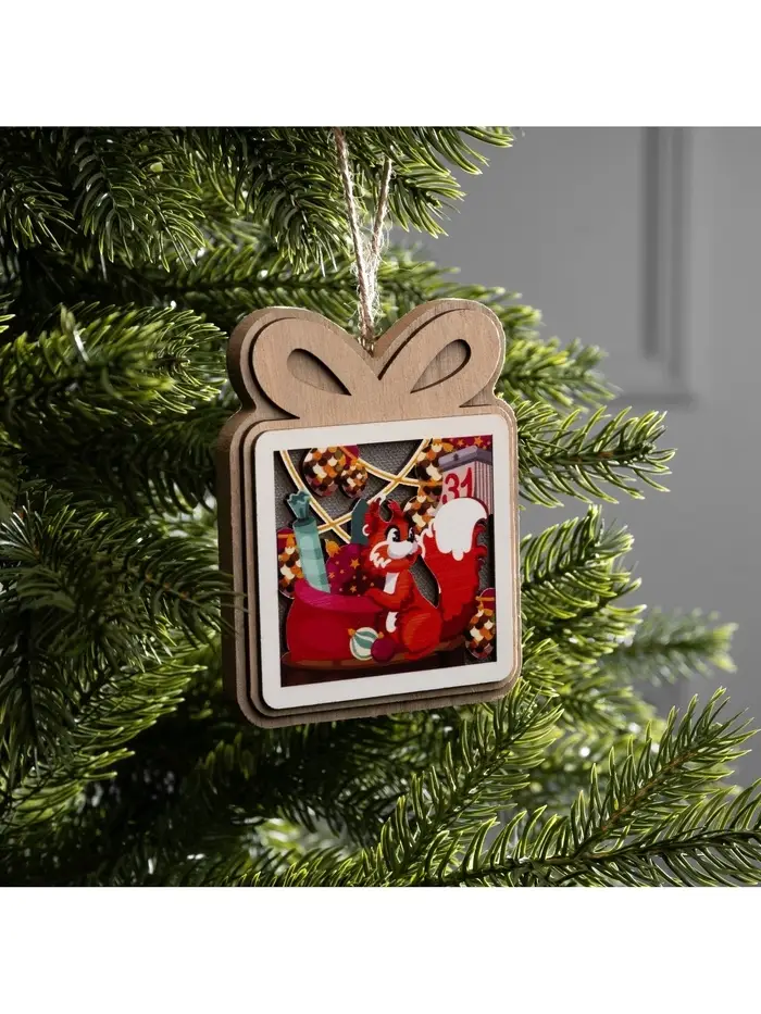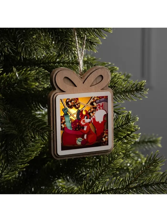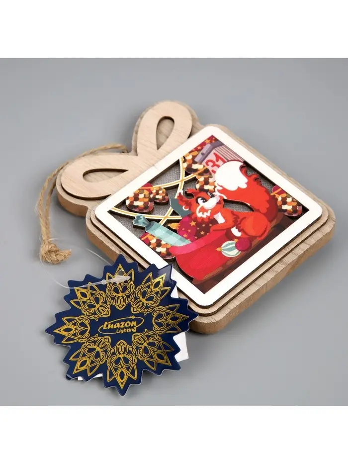 Световая подвеска с фигуркой белочки добавляет интерьеру живость и уют, создавая мягкое тёплое свечение и атмосферу новогоднего настроения. Резной деревянный декор с аккуратным рисунком делает изделие выразительным акцентом, который гармонично смотрится как на ёлке, так и в композициях с гирляндами и украшениями.