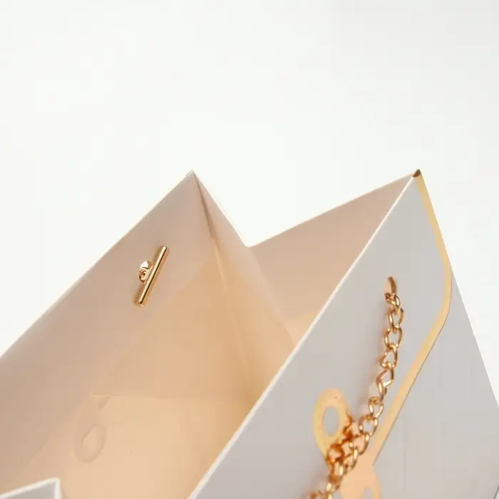 - Металлическая цепь: Прочная декоративная ручка добавляет статусности. Цепь не врезается в пальцы и выдерживает вес небольшого букета.