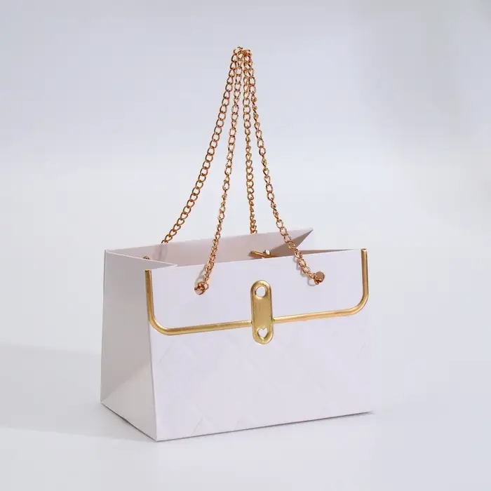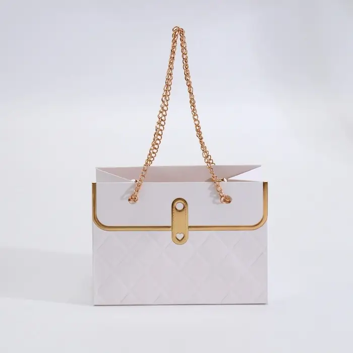 Роскошная подача для особенных букетов! Белая переноска для цветов с золотым тиснением — элегантная упаковка с металлической цепью вместо ручки. Компактный размер (15×10,5×10 см) подчеркивает ценность каждого цветка в композиции.