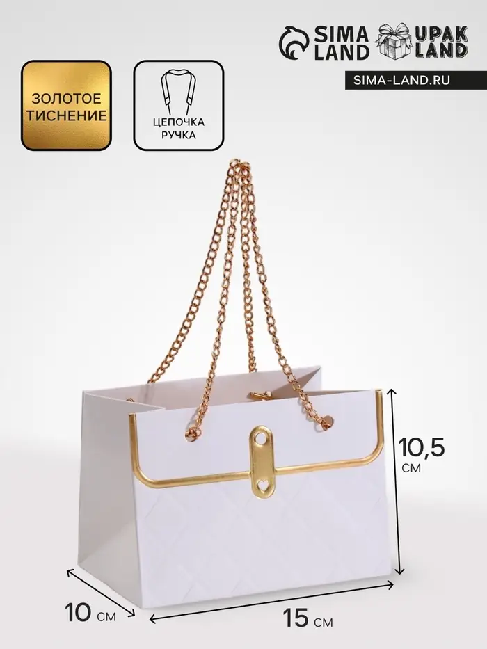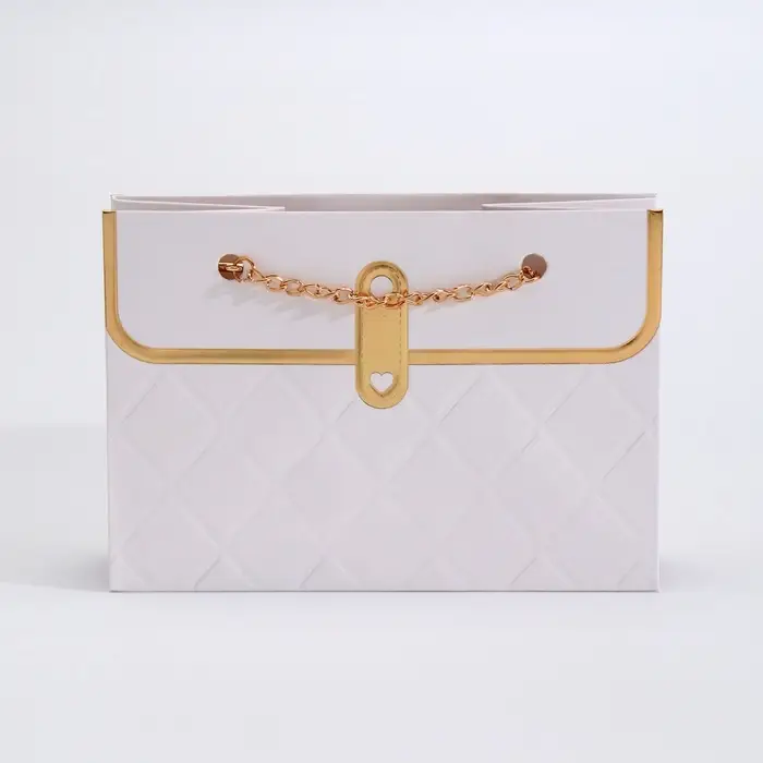 Пакет переноска для цветов, ручка цепь, «Белый», с золотым тиснением, 15×10.5×10 см