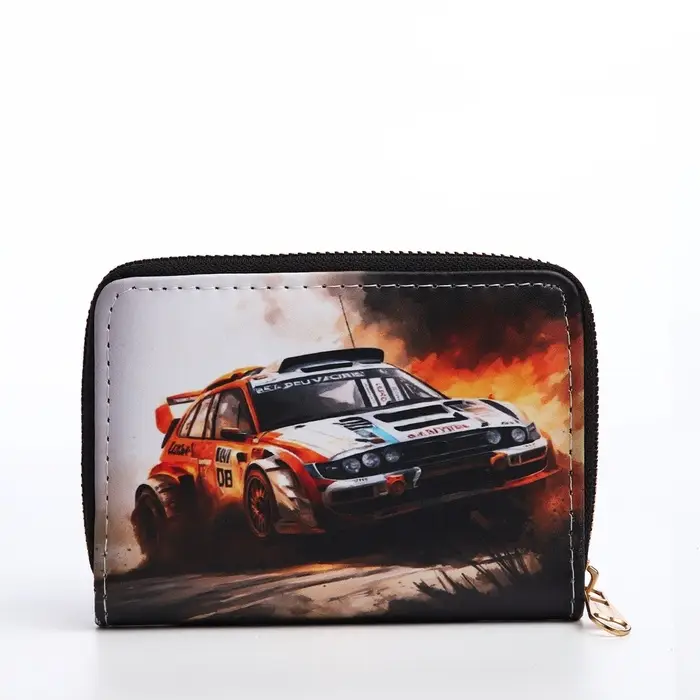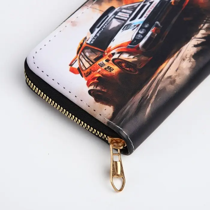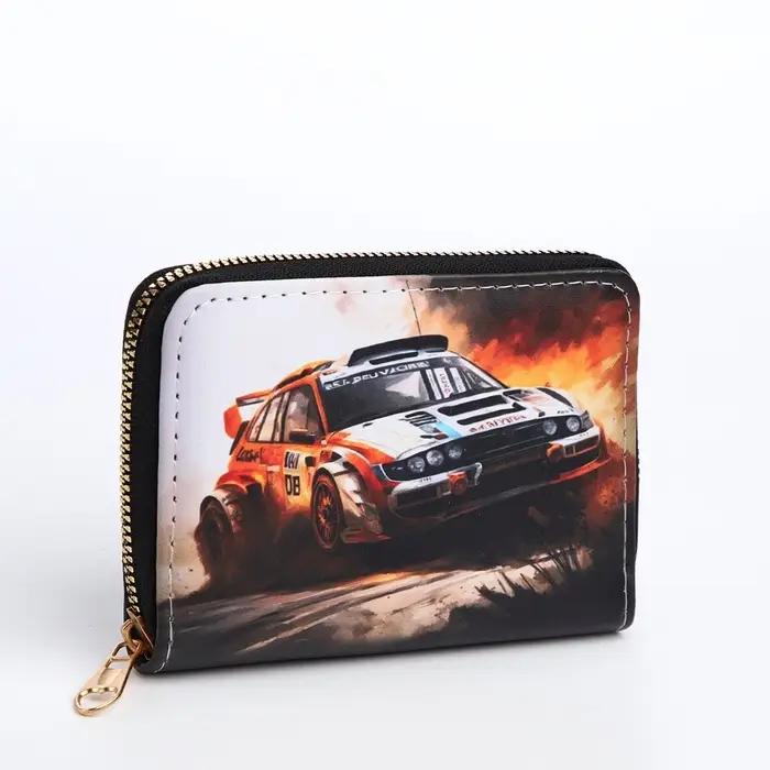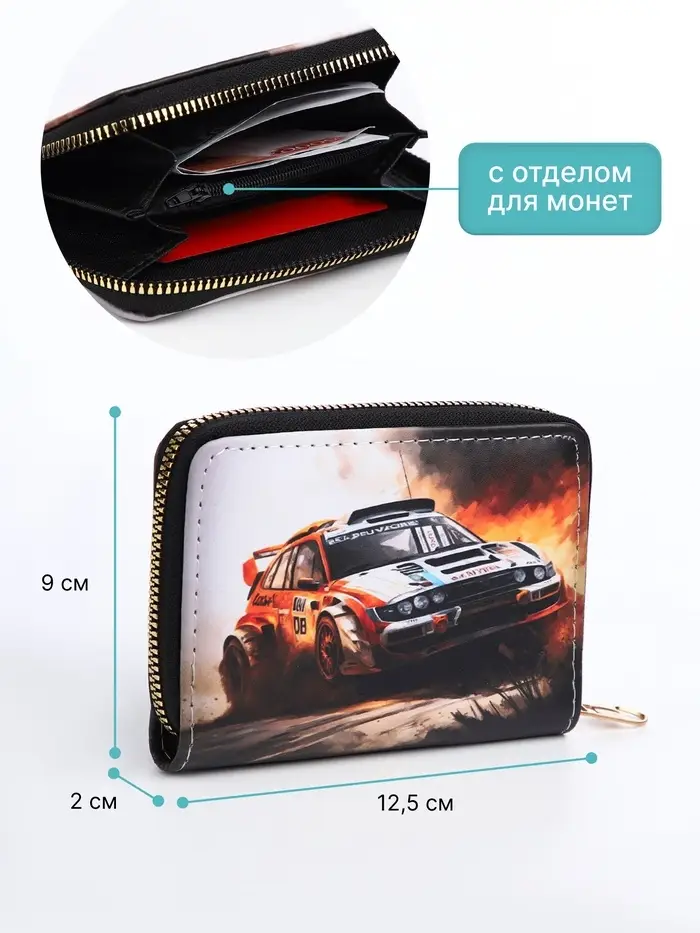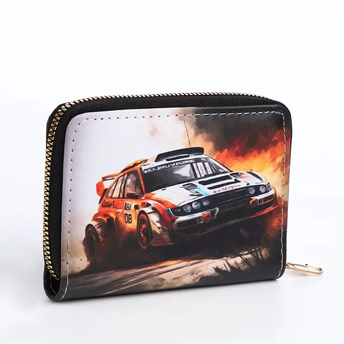 - Яркий оранжевый кошелёк с динамичным принтом в тематике транспорта.