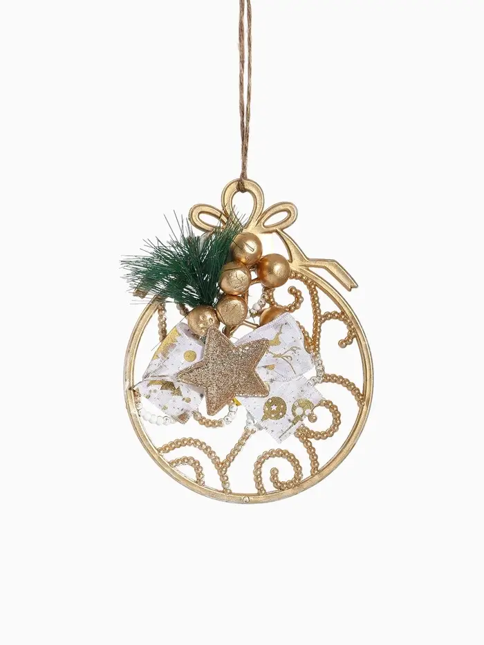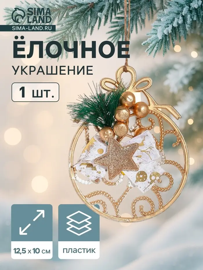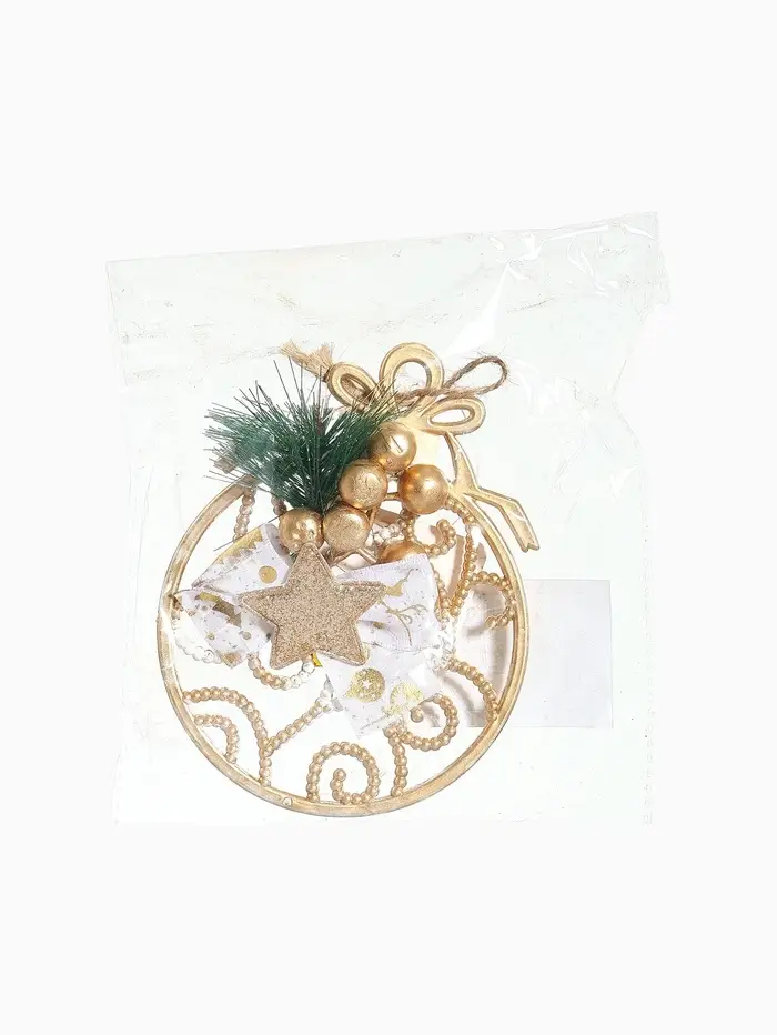 Новогодний шар с декоративной веточкой выполнен из пластика в стиле ар-деко с элементами датского дизайна. Золотистый оттенок и наполненная структура создают глубину и праздничное сияние, подчёркивая изысканность новогоднего интерьера. Диаметр 10 см подходит для разнообразных вариантов украшения ёлки и праздничных композиций.