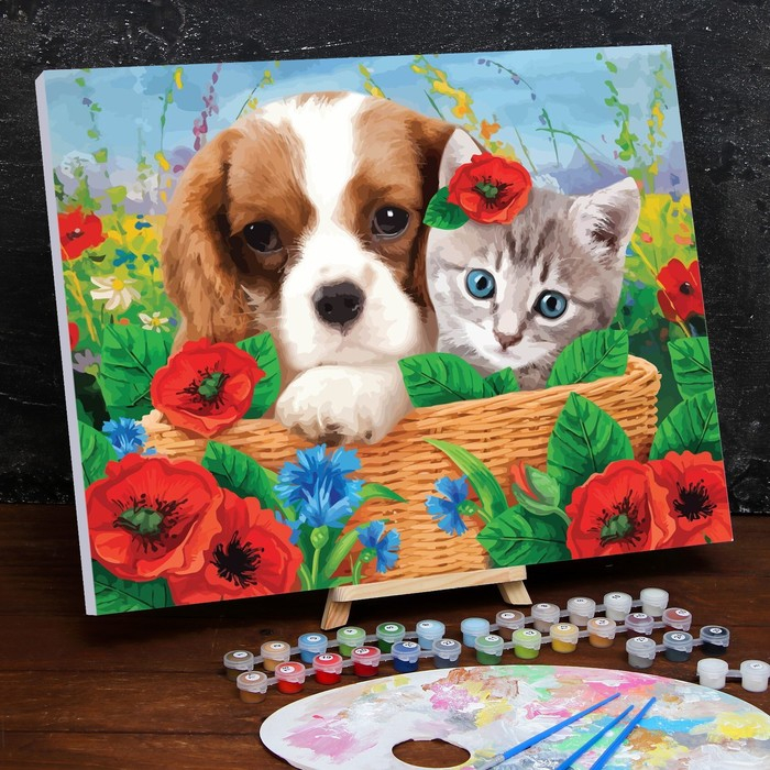 Картина по номерам на холсте с подрамником «Котенок и щенок», 40 х 50 см понравится и детям, и взрослым.