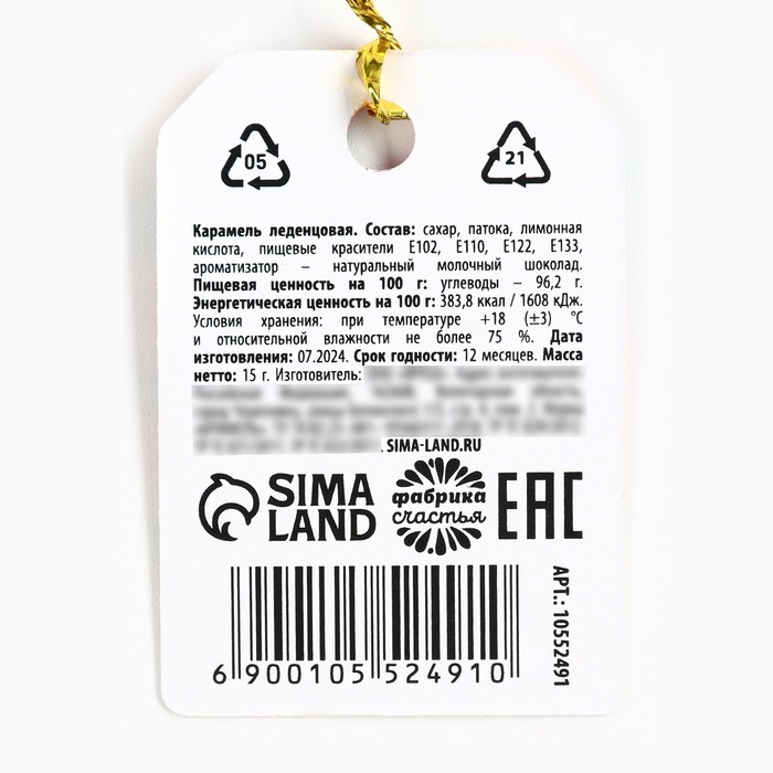 Состав: сахар, патока, лимонная кислота, пищевые красители Е102, Е110, Е122, Е133, ароматизатор – натуральный молочный шоколад.