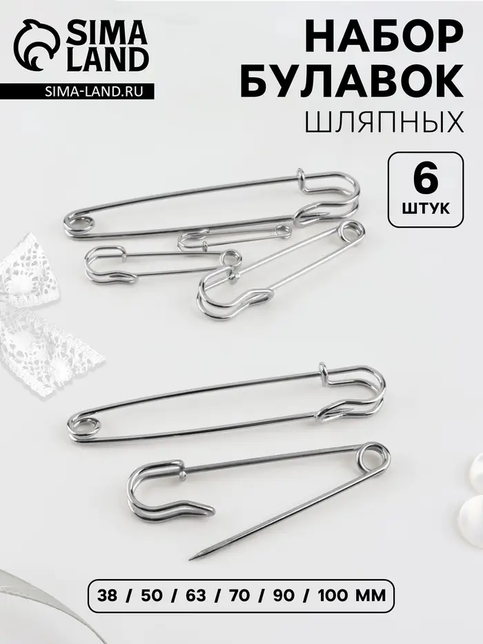 Набор булавок шляпных, 38/50/63/70/90/100 мм, 6 шт.