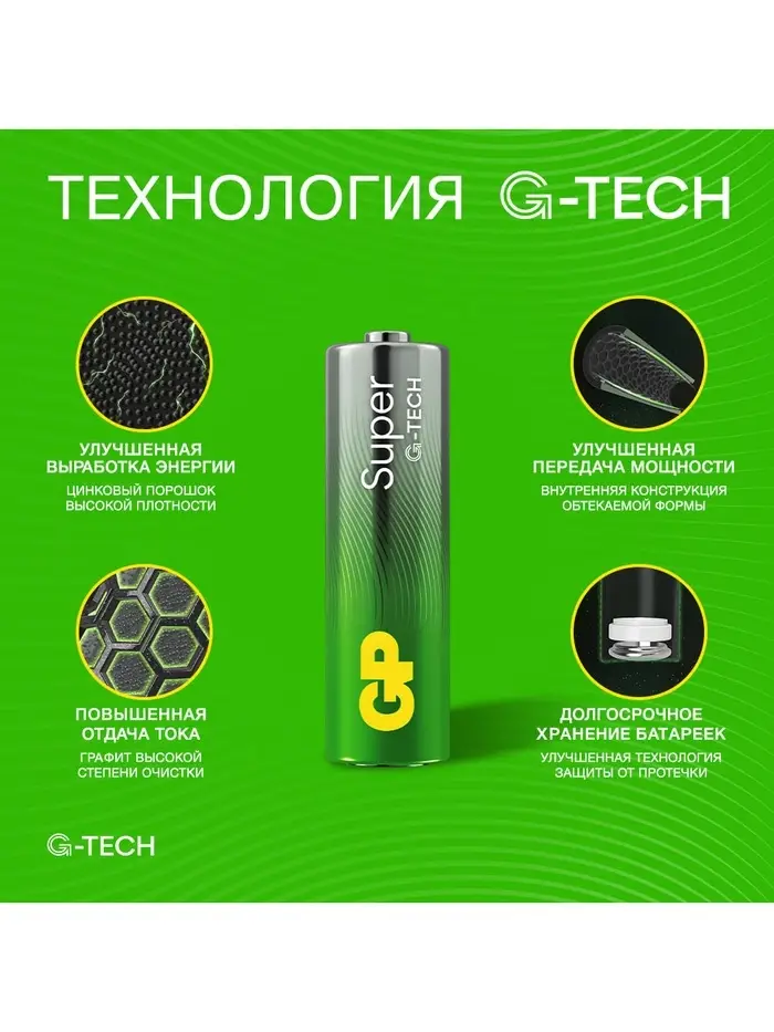 Новая линейка батареек GP Super Alkaline с технологией G-TECH, которая обеспечивает до 50%* больше мощности, позволяя вам наслаждаться использованием ваших устройств без перерывов. Технология G-TECH гарантирует длительное время службы ваших устройств. Благодаря использованию графита высокой чистоты и высококачественного порошка цинка S, батарейки обеспечивают высокую мощность и стабильное напряжение на протяжении продолжительного времени. Запатентованная система предотвращения протечек обеспечивает безопасность использования и защиту ваших устройств. Эти щелочные батарейки выделяются соотношением цены и качества и идеально подходят для повседневных устройств, таких как часы, пульты дистанционного управления и другие. Выберите батарейки GP Super Alkaline с технологией G-TECH для надежной работы ваших устройств.