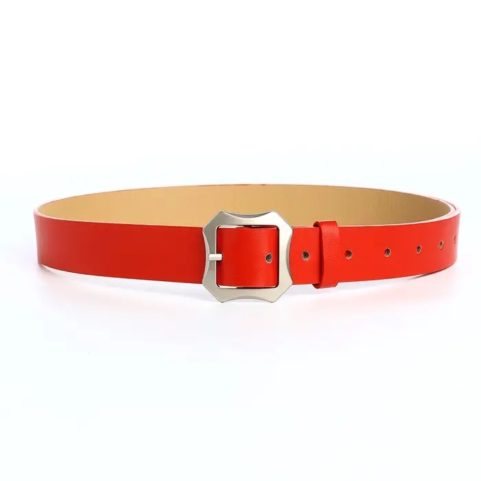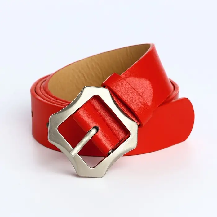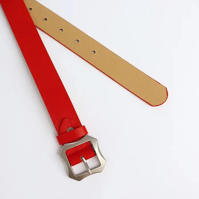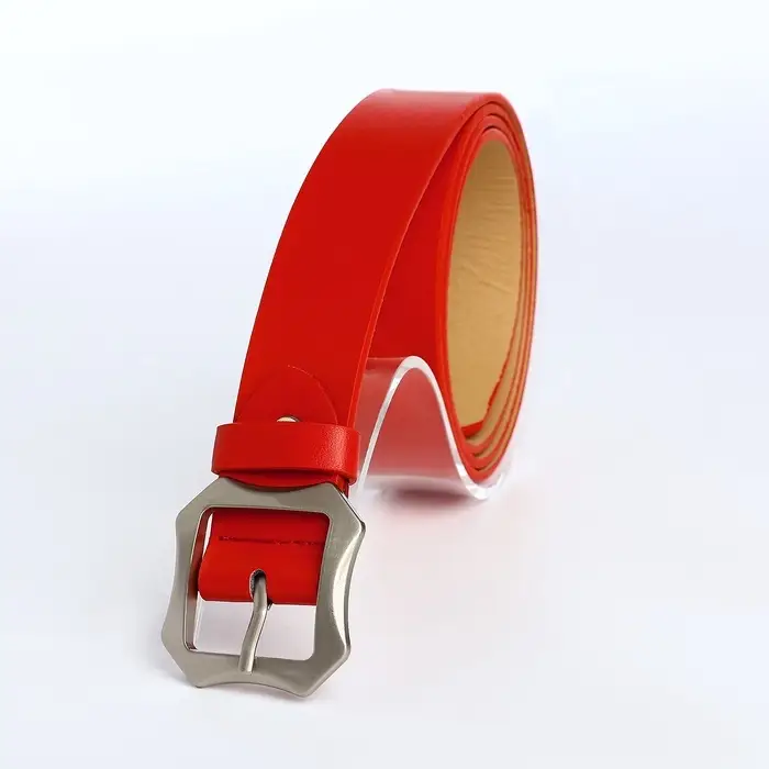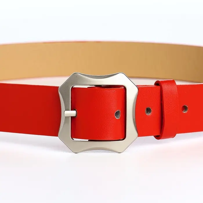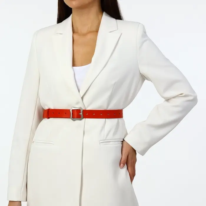 Женский красный ремень с матовой пряжкой — акцентная деталь, которая дополняет образ. Контраст насыщенного цвета и серебристой фурнитуры создаёт сбалансированное сочетание. Узкий профиль ремня гармонично смотрится с разными фасонами одежды, от зауженных брюк до платьев с высокой талией.
