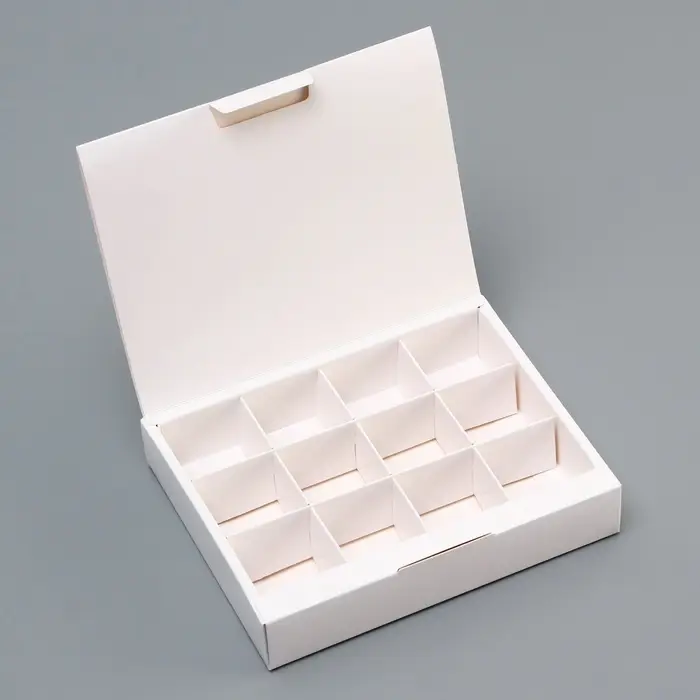 - Вместимость на 12 конфет: Коробка размером 19×15×3,5 см оснащена 12 ячейками для аккуратного размещения конфет. Подходит для трюфелей, шоколадных конфет, пралине, карамели. Идеально для подарочных наборов и продажи на вынос.