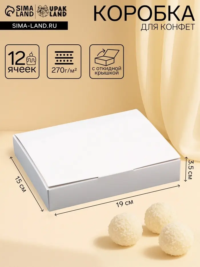 Коробка для 12 конфет, белая с откидной крышкой, 19×15×3.5 см