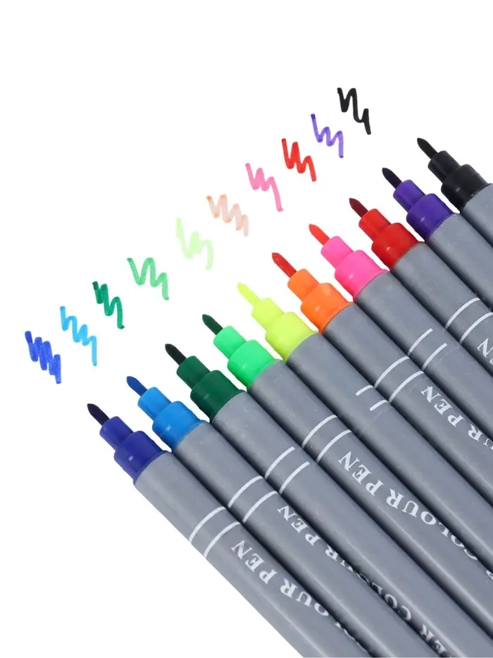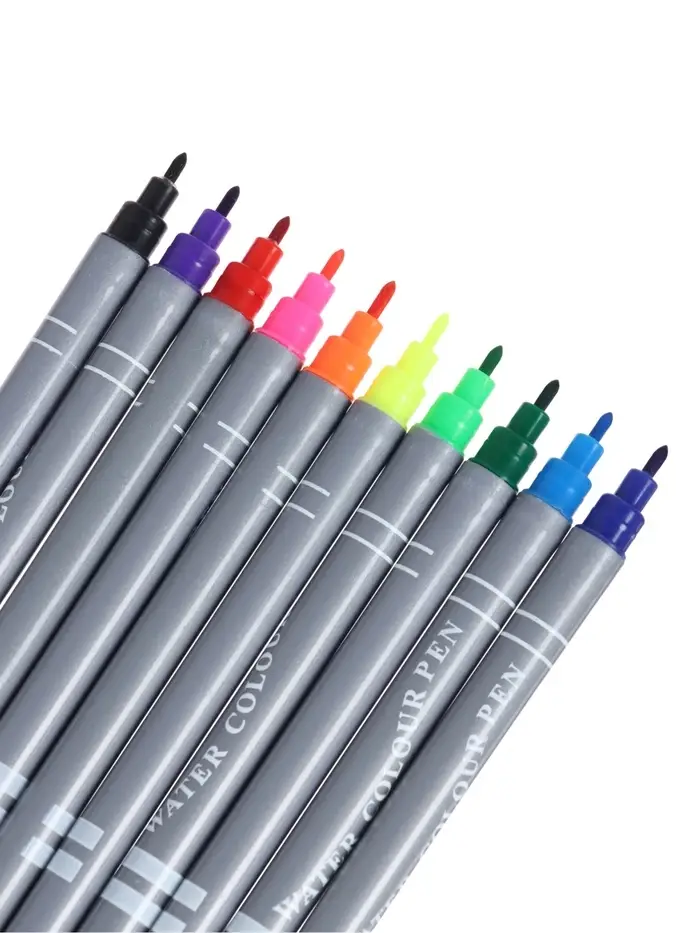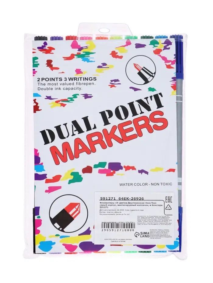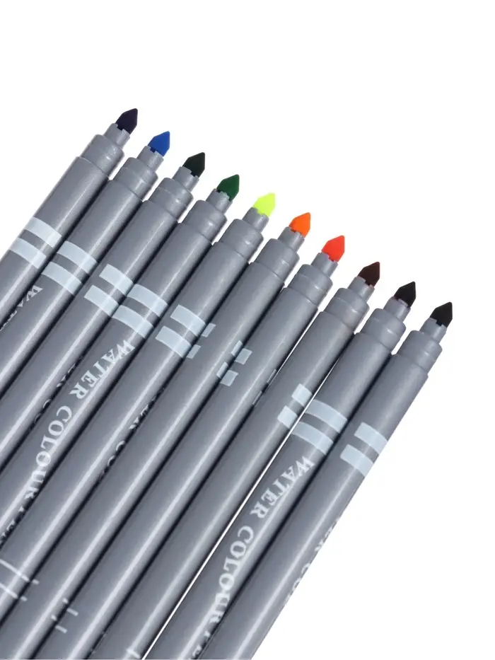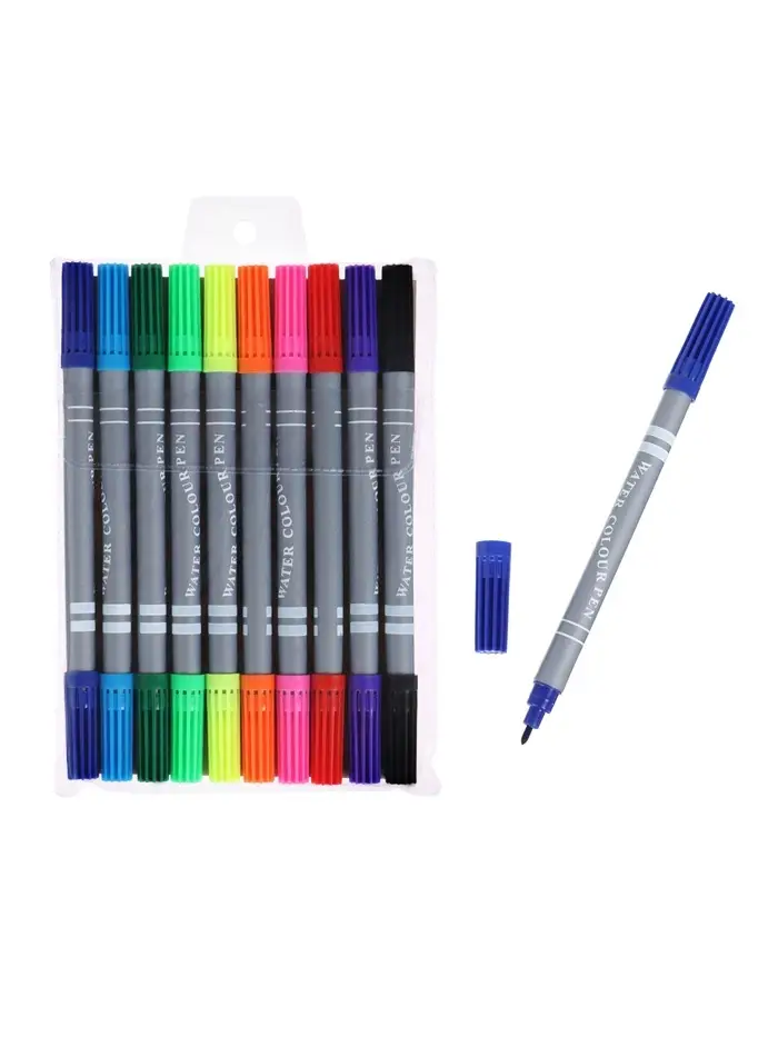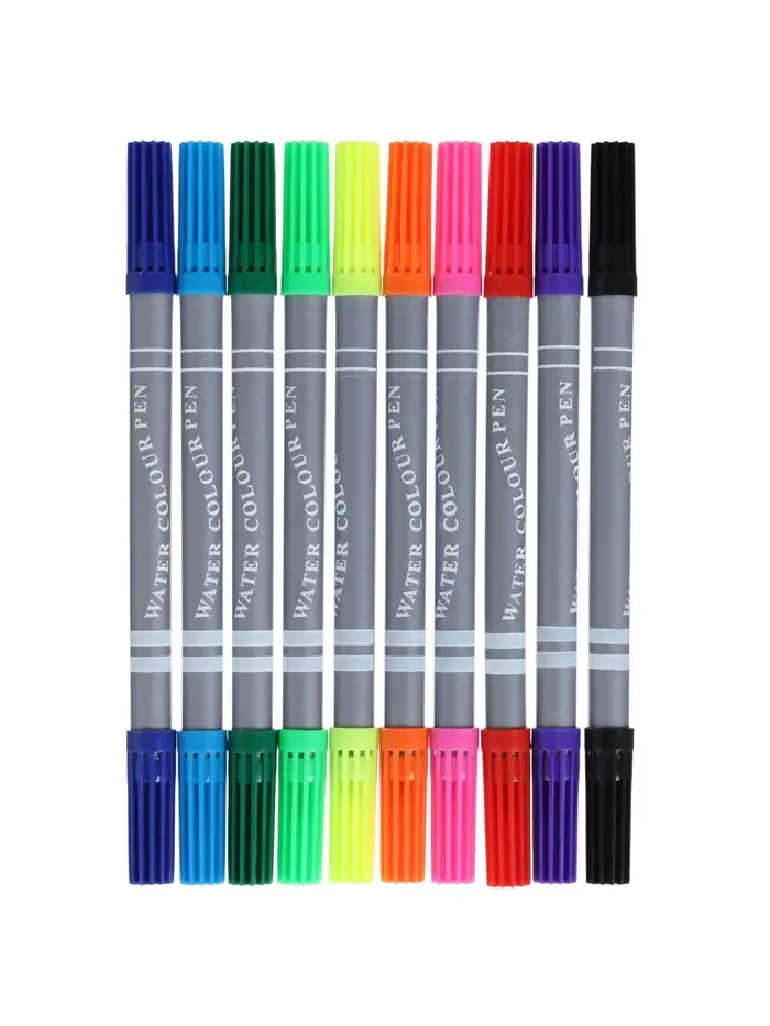 Фломастеры 10цв. Двусторонние- 2мм/ 5мм, серый корпус с 10 цв.етными колпачками – отлично зарекомендовали себя среди детей и взрослых. Они идеально подходят для рисования благодаря своей яркой и сочной палитре, легко отстирываются от одежды и кожи, а также имеют прочный пластиковый корпус и пишущий узел.