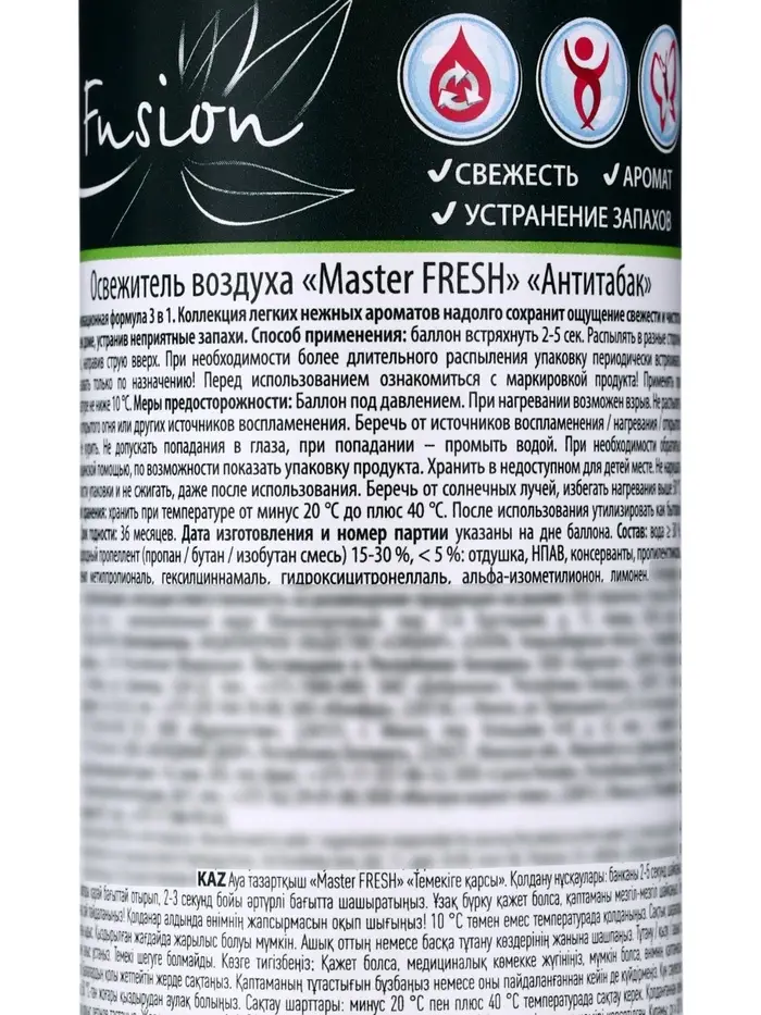 Состав: вода, углеводородный пропеллент 15-30%, отдушка 5%, нпав 5%, консерваны 5%, пропиленгликоль 5%.