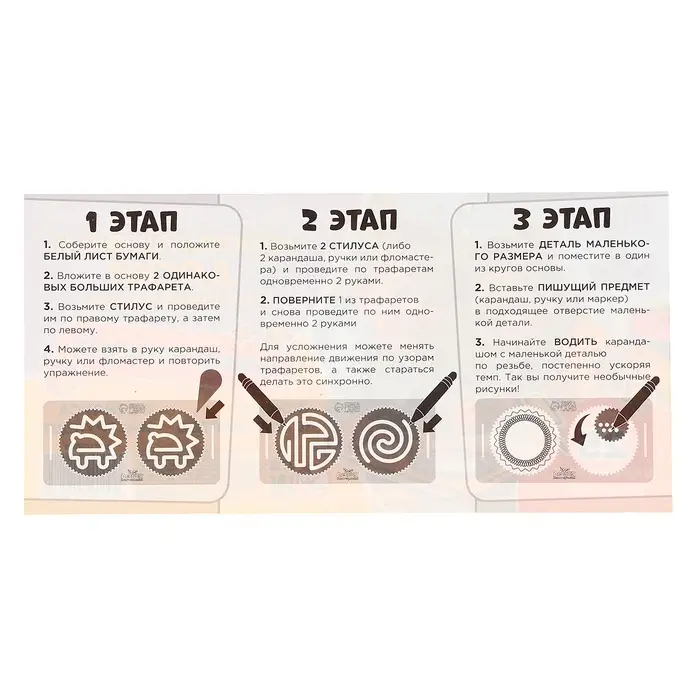 Смысл тренажера заключается в том, чтобы одновременно двумя руками обводить разные узоры стилусами. Такие занятия стимулируют работу обоих полушарий мозга: левого, отвечающего за аналитические способности, и правого, который несет ответственность за интуицию и творчество.