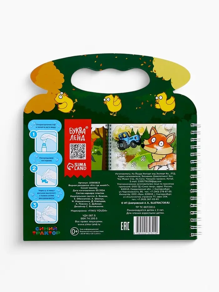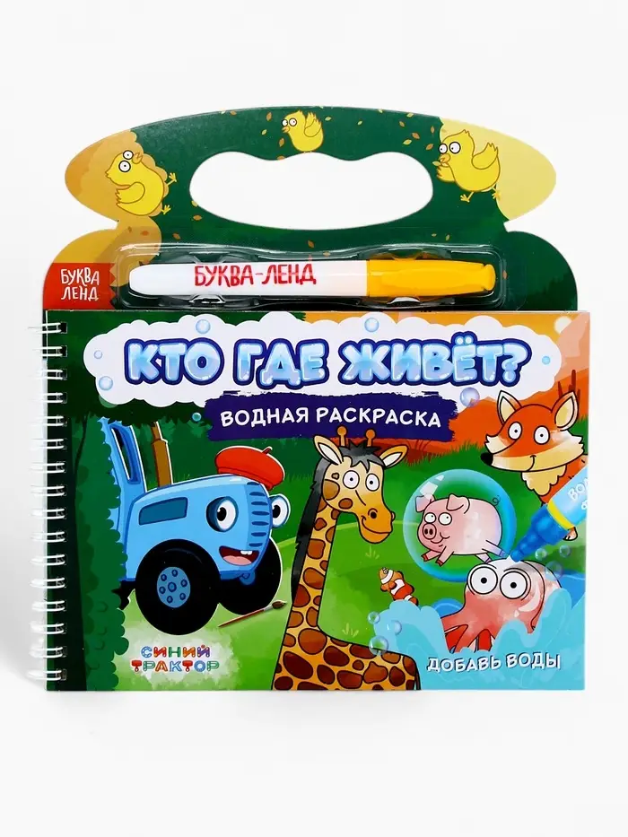 Многоразовая раскраска «Рисуем водой. Кто где живёт?» с Синим трактором — это увлекательное занятие для детей от 3 лет, где любимые персонажи оживают под воздействием воды. В комплект входит специальный фломастер, который заправляется водой, и 8 страниц с изображениями синим трактором и его друзей. Интегральный переплёт на пружинке делает книгу удобной для использования дома или в дороге.